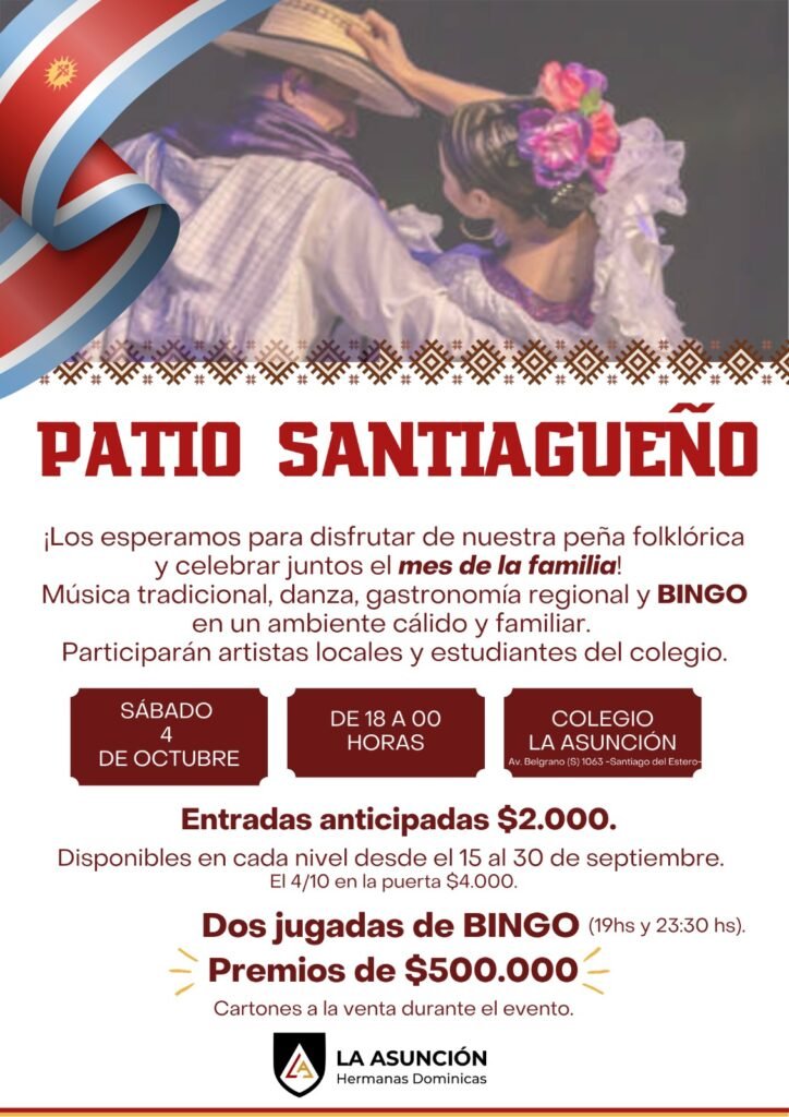 Nuestra comunidad se prepara para vivir el Patio Santiagueño, una fiesta llena de tradiciones que tiene un fin solidario porque todo lo recaudado será destinado a la reconstrucción de la capilla del colegio, un lugar emblemático que tanto anhelamos volver a habilitar.